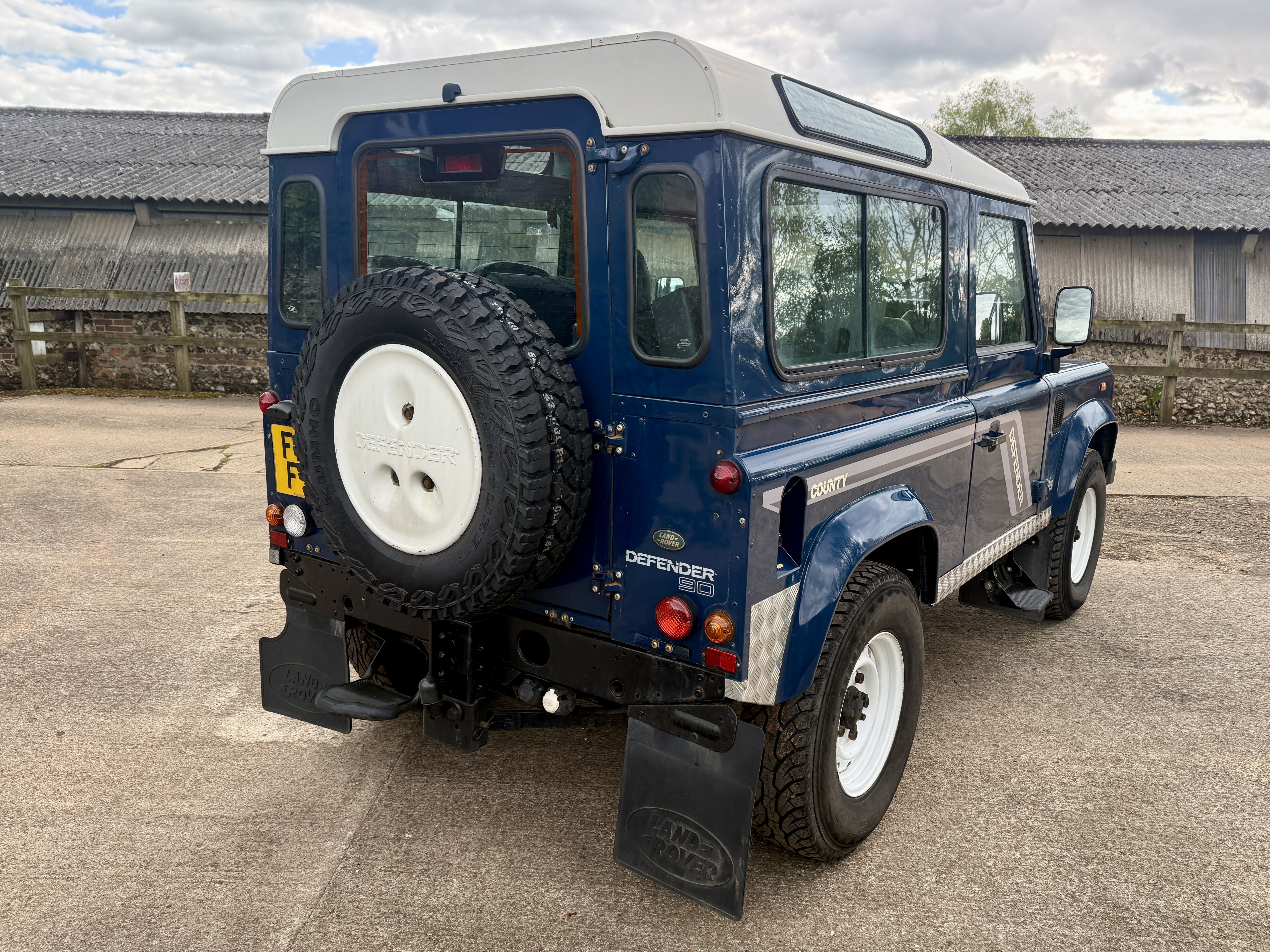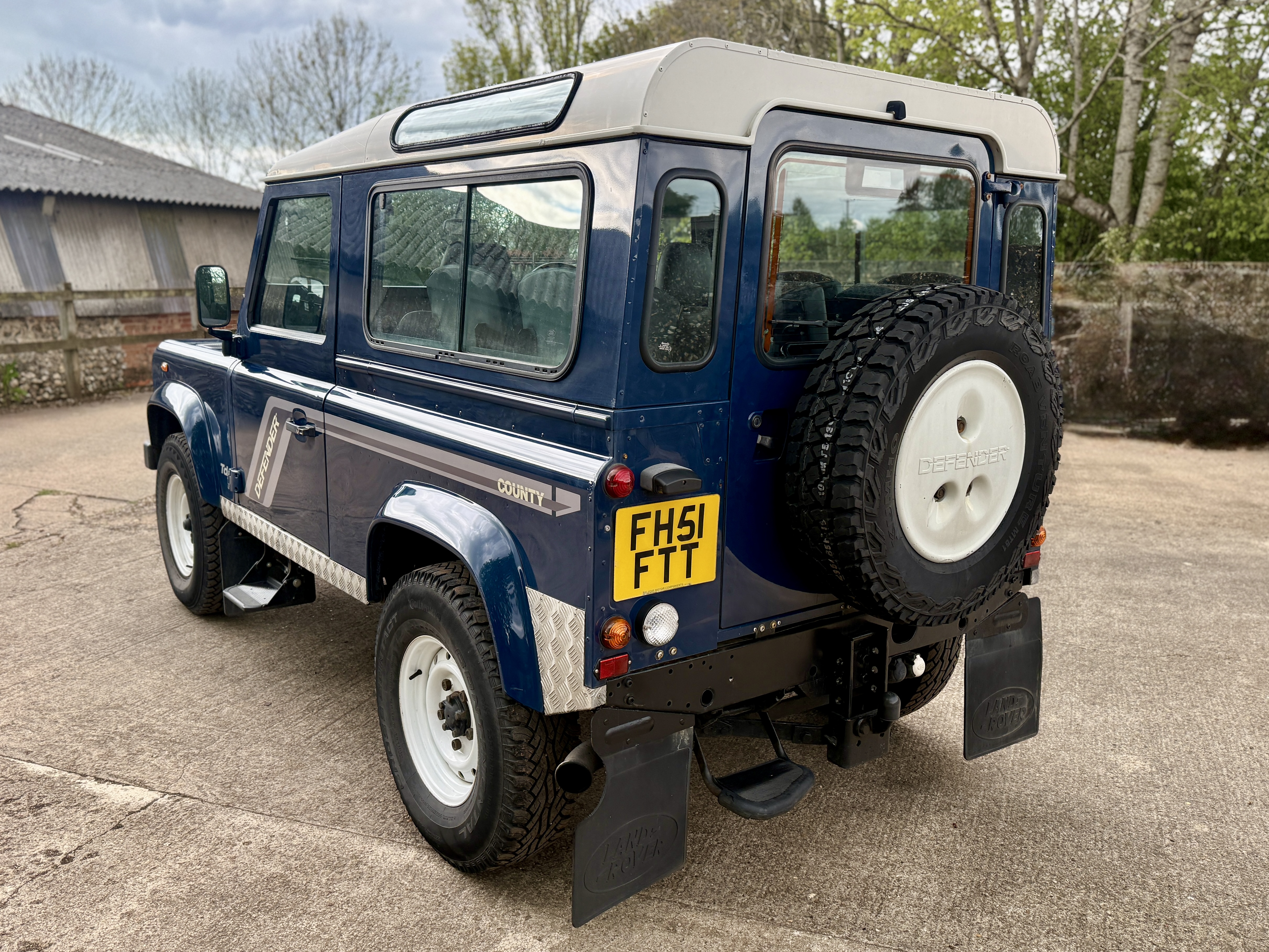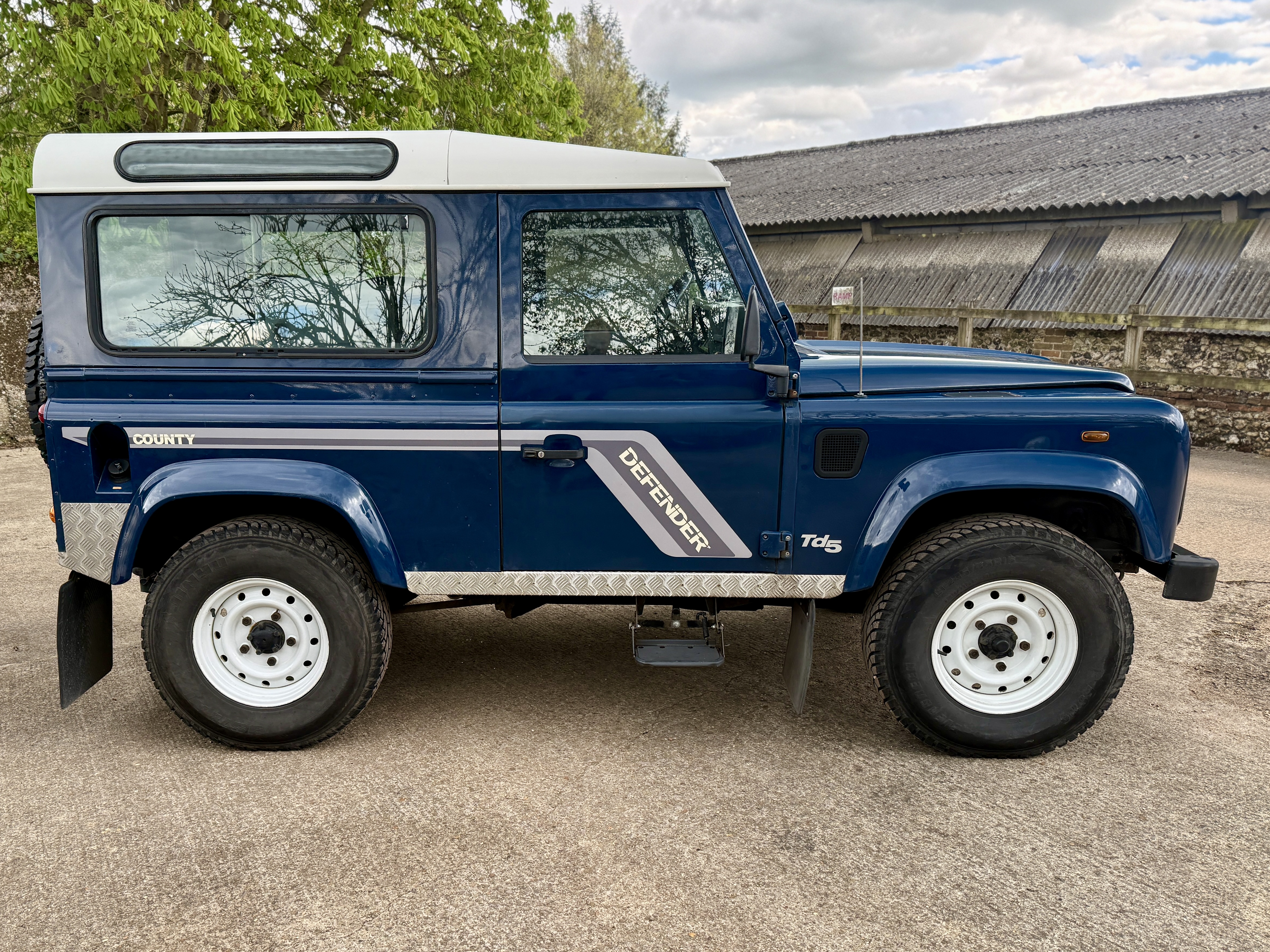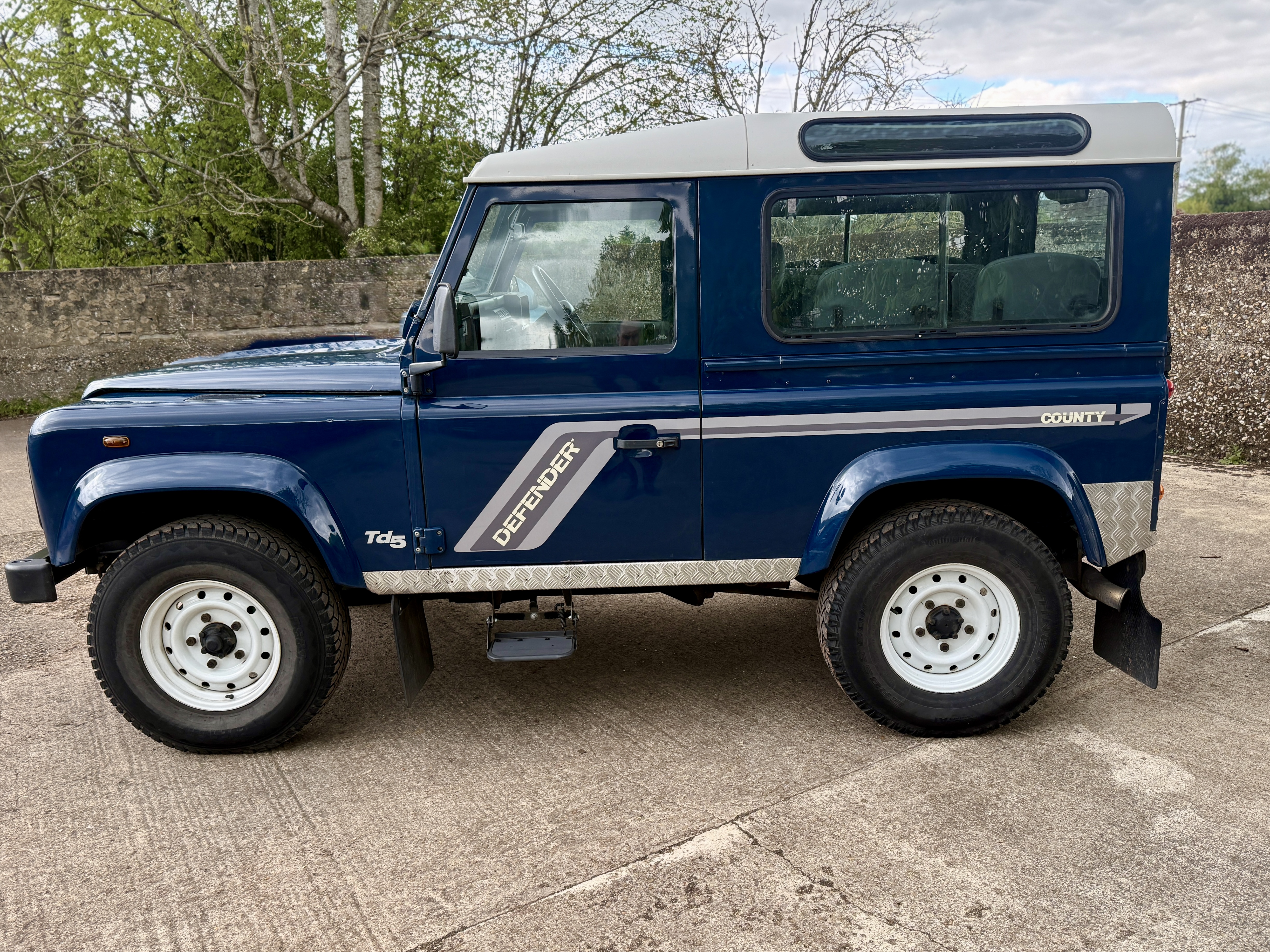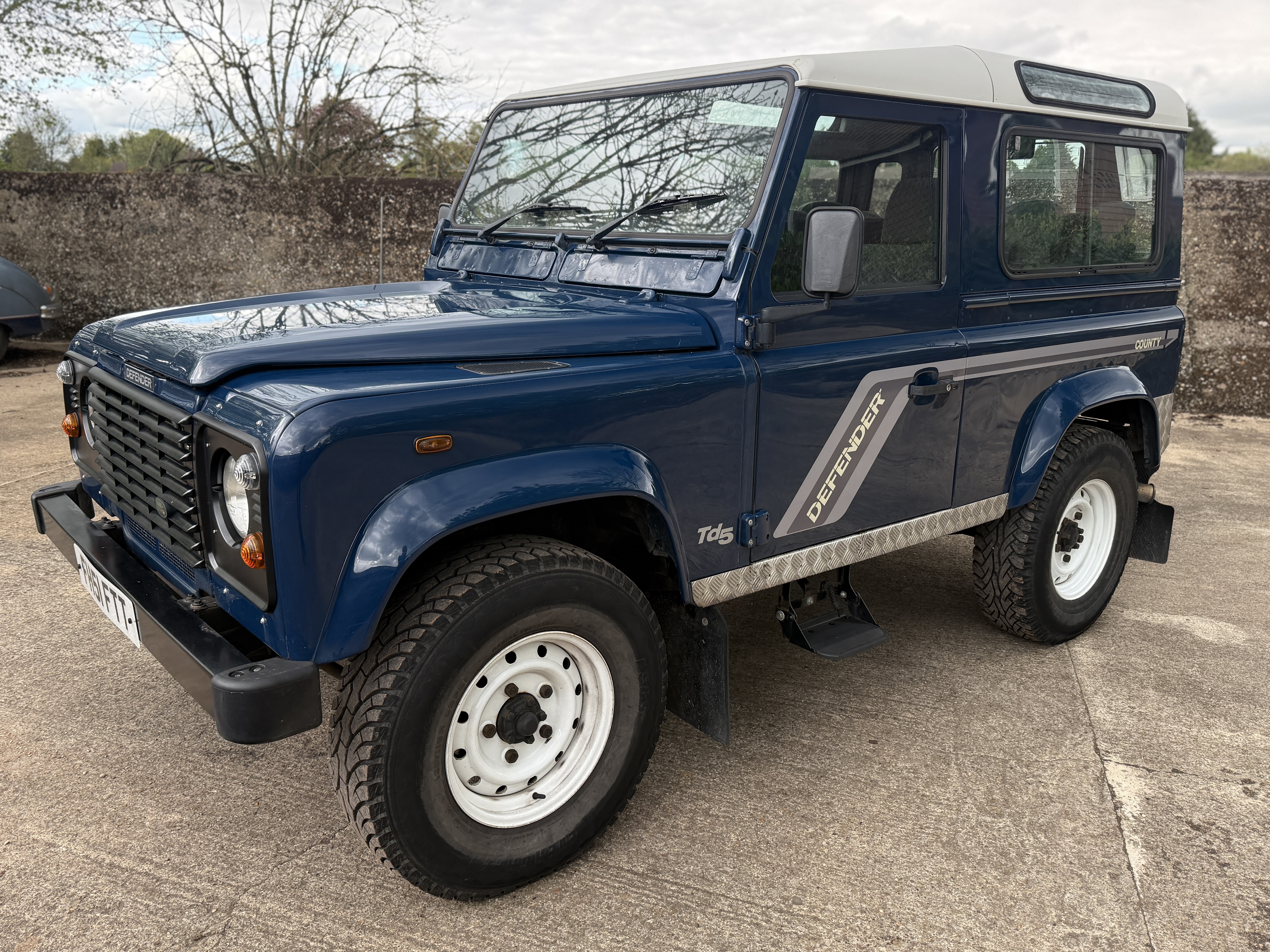 motodrome offer this very smart 2002 Land Rover Defender 90 TD5 County Station Wagon 6 seater, finished in Blue with White roof and contrasting grey techno cloth trim.