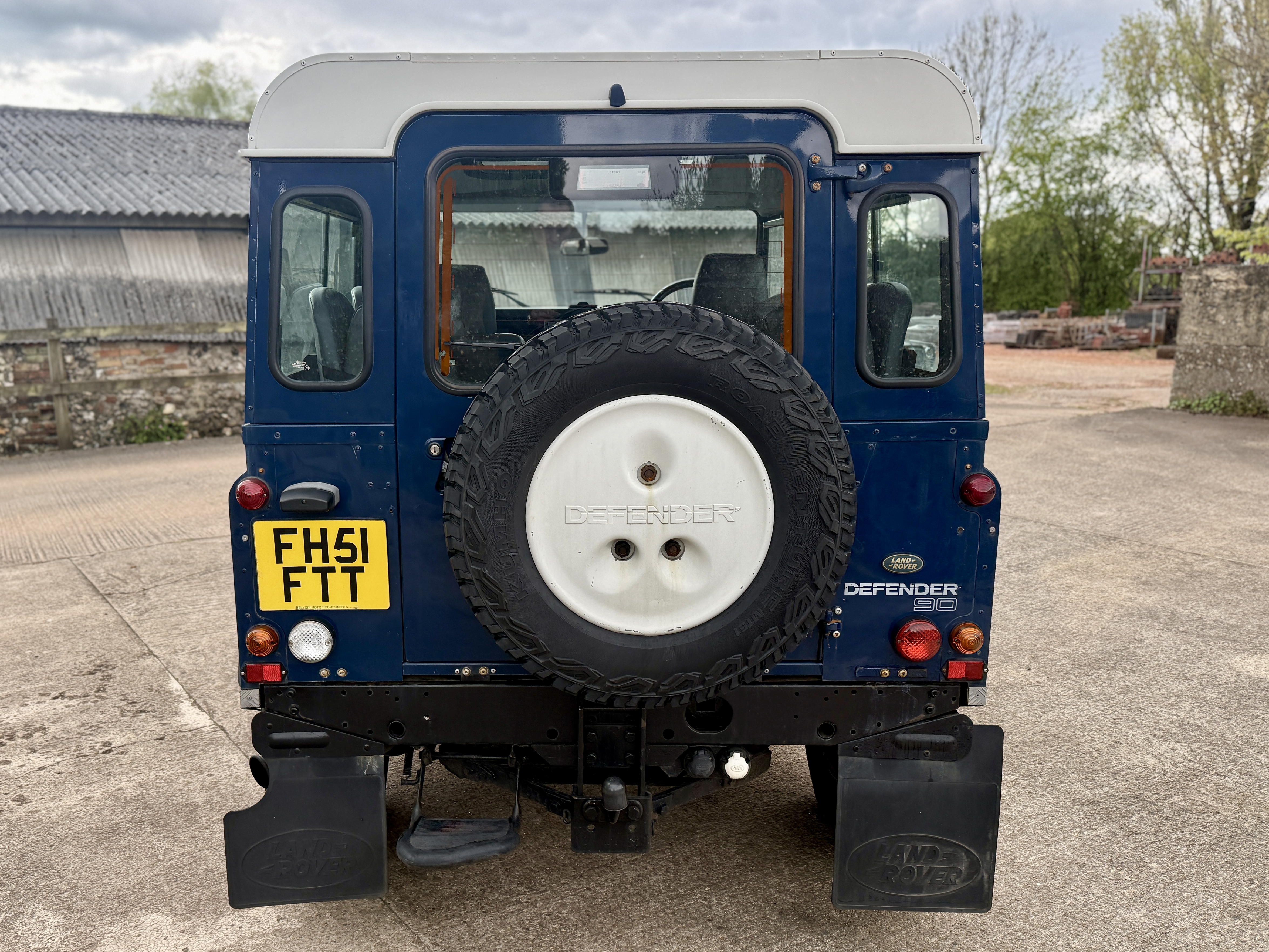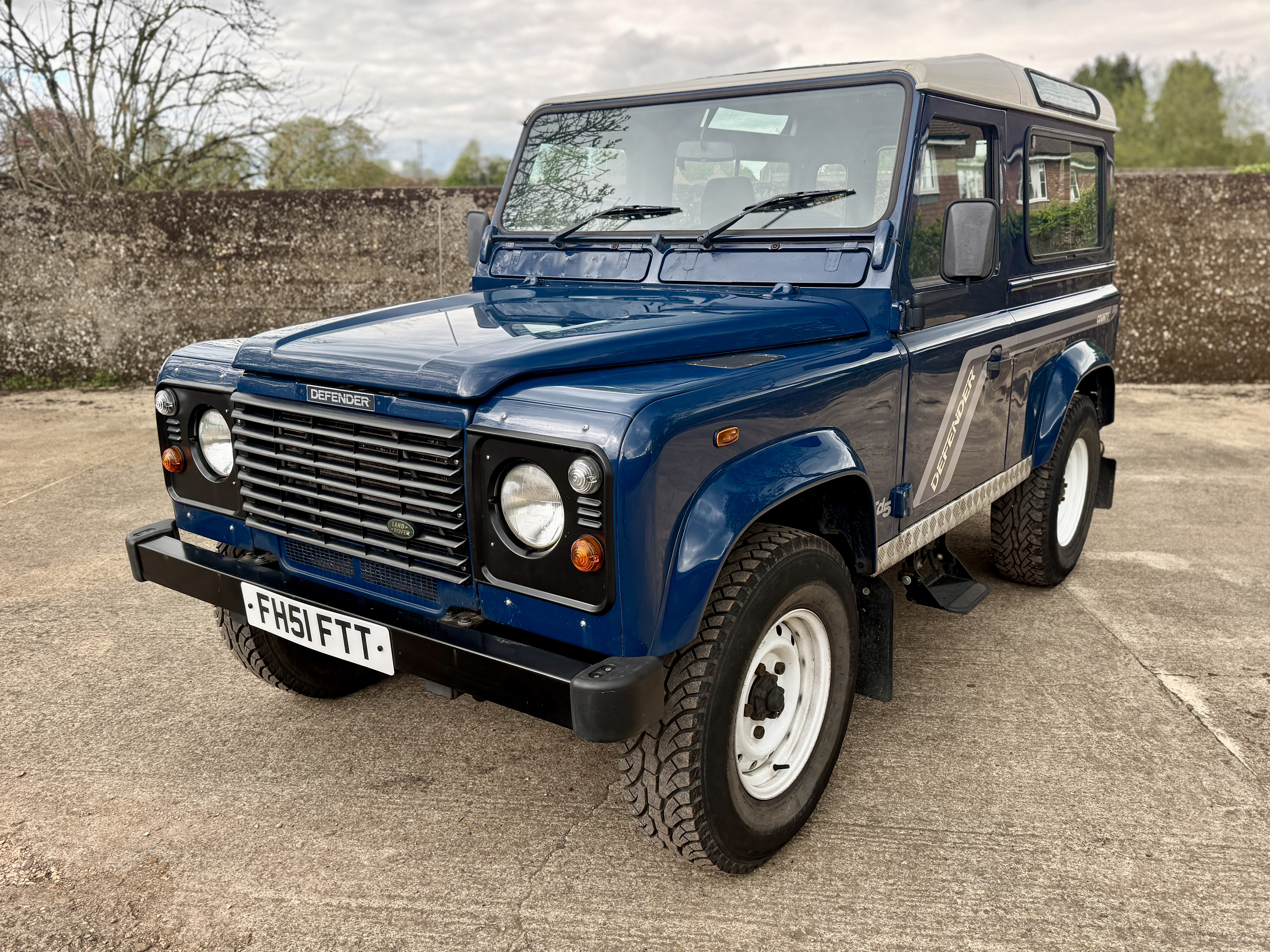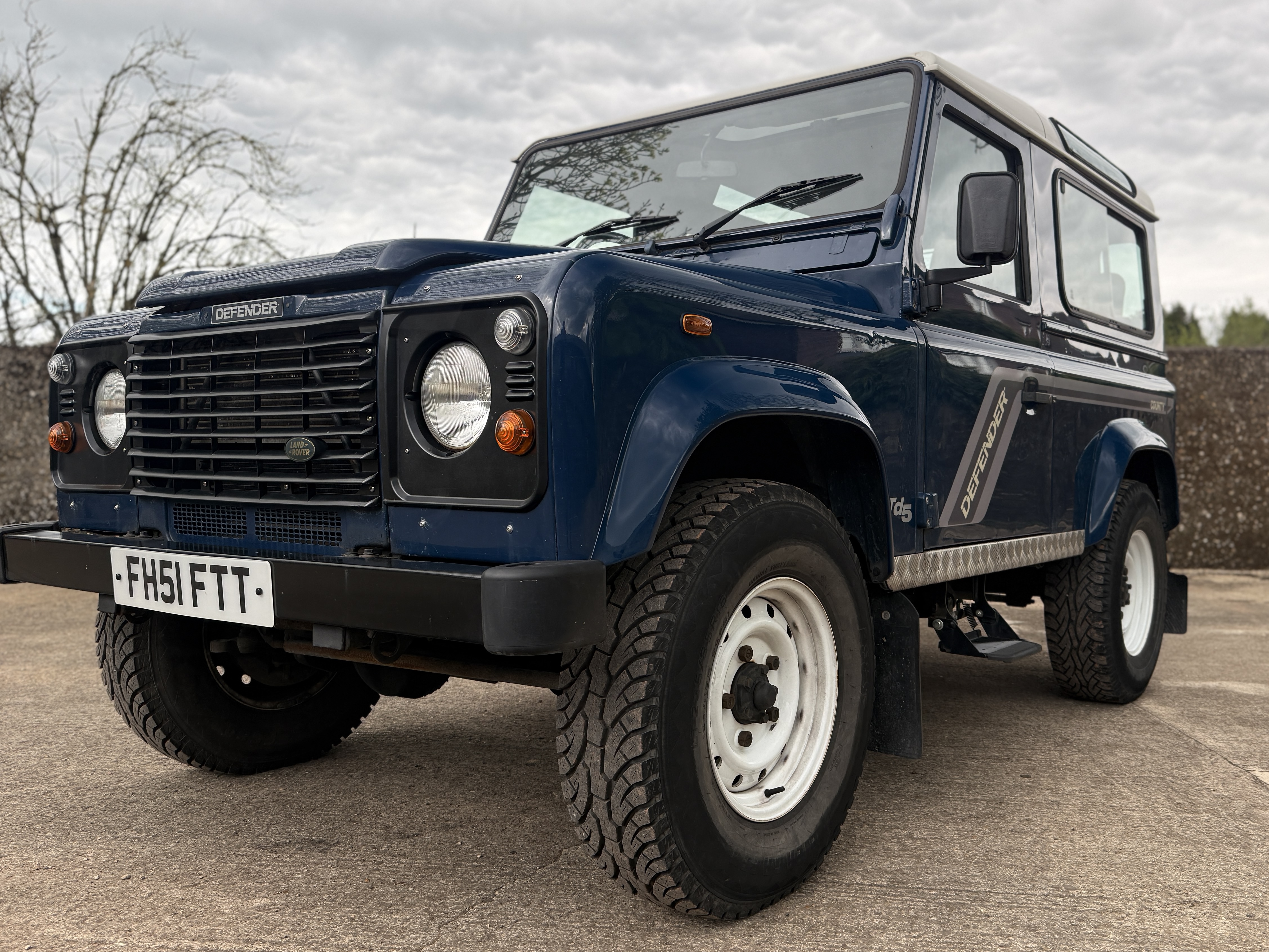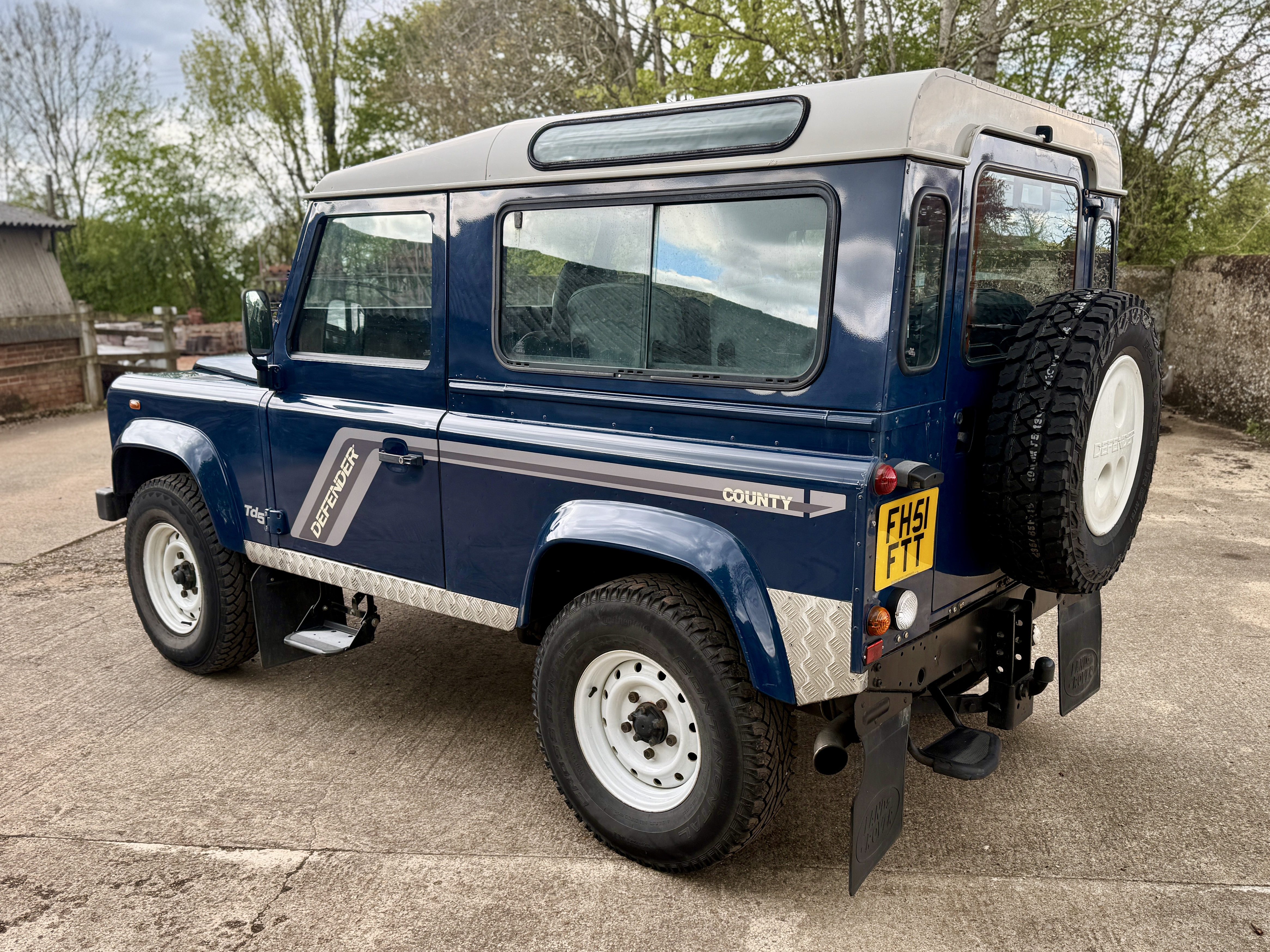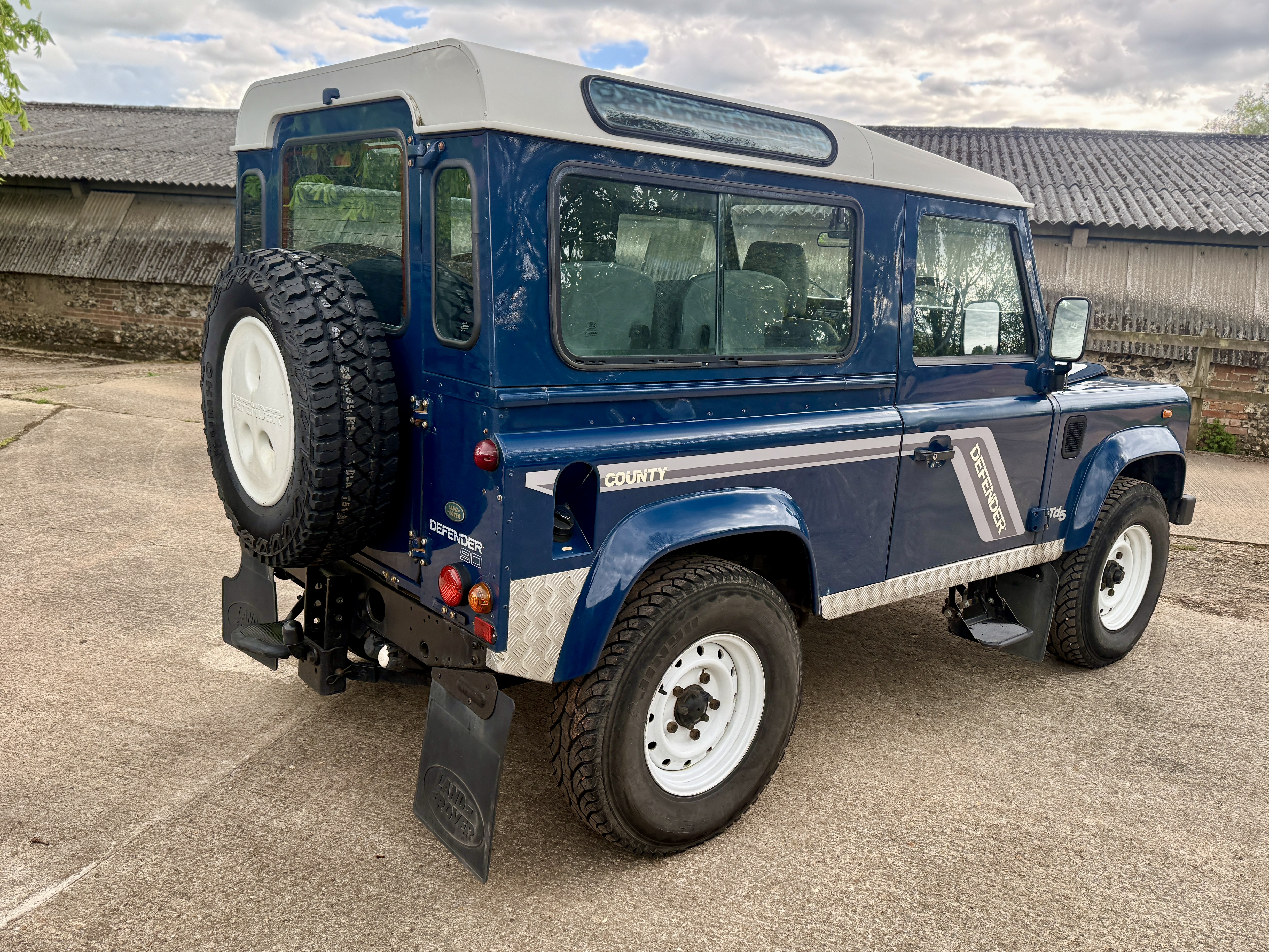 motodrome offer this very smart 2002 Land Rover Defender 90 TD5 County Station Wagon 6 seater, finished in Blue with White roof and contrasting grey techno cloth trim.