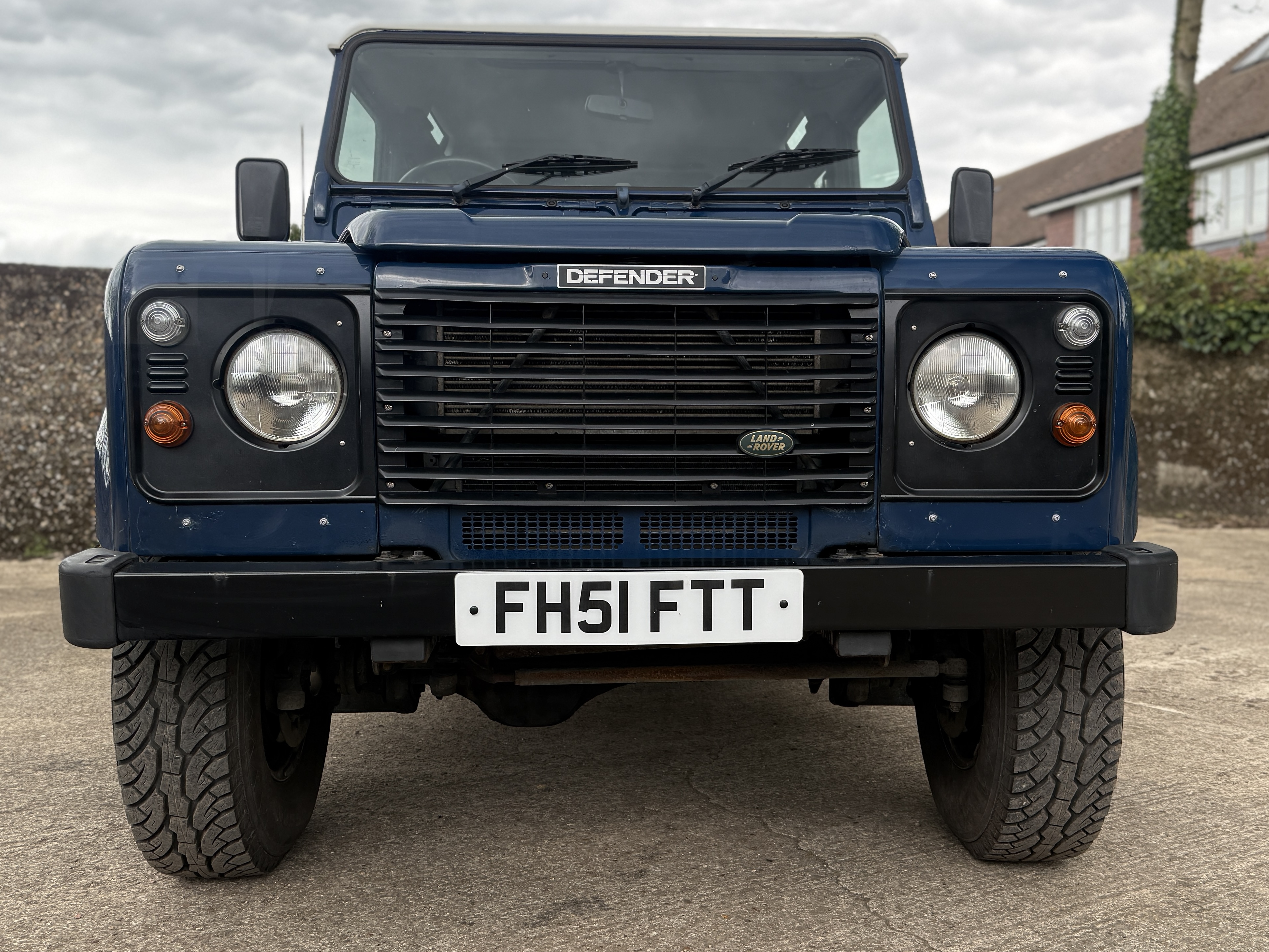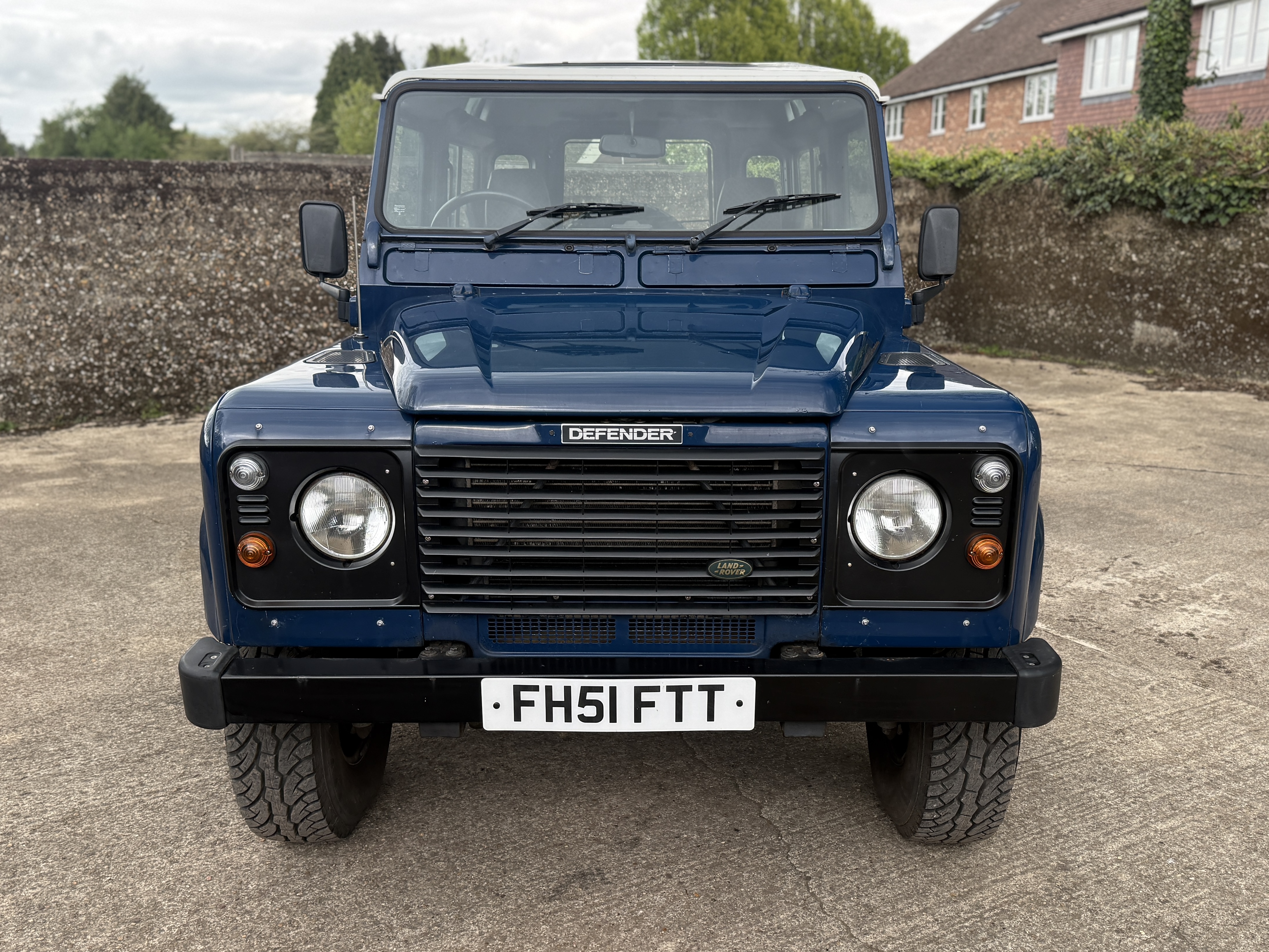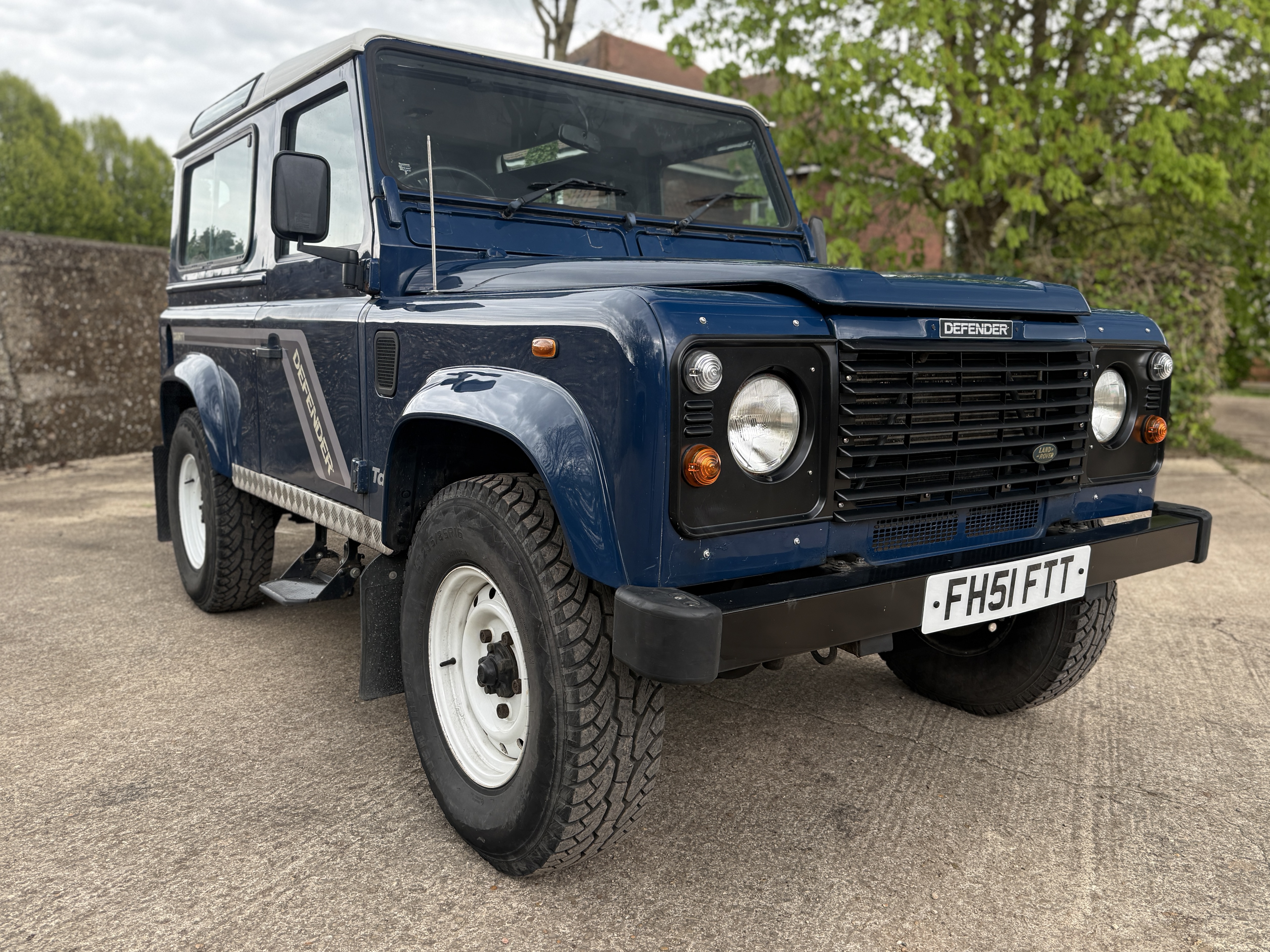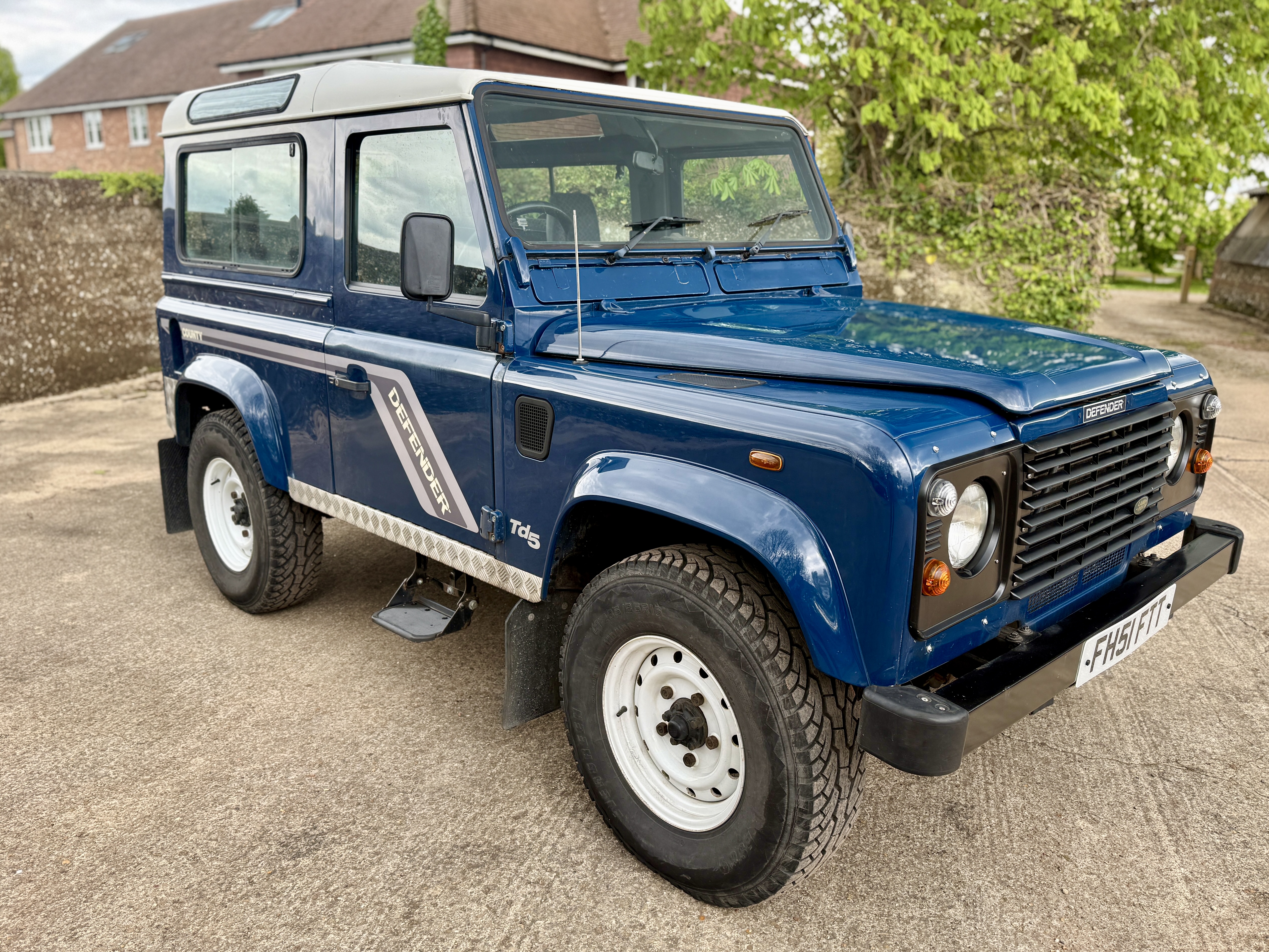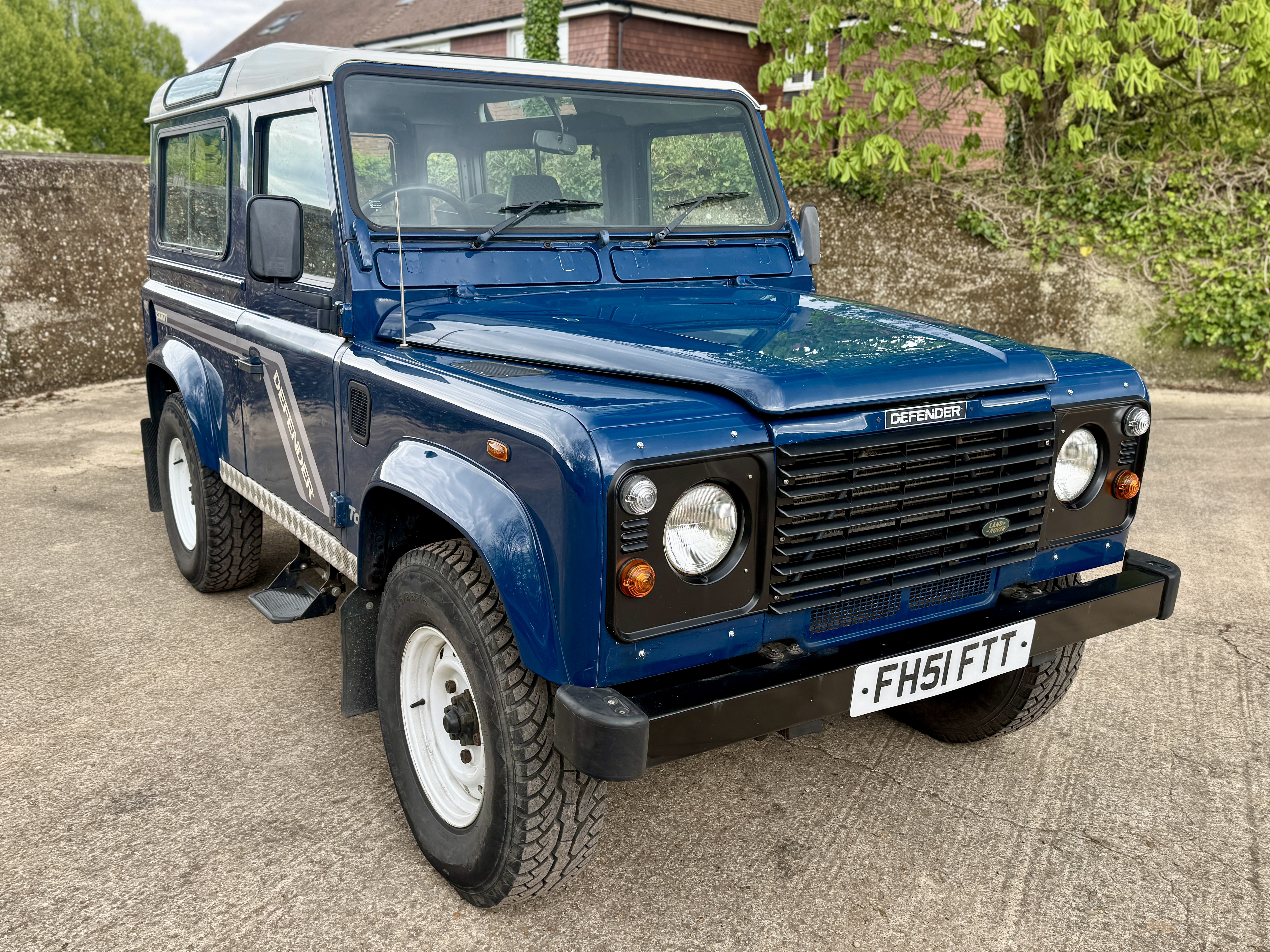 motodrome offer this very smart 2002 Land Rover Defender 90 TD5 County Station Wagon 6 seater, finished in Blue with White roof and contrasting grey techno cloth trim.